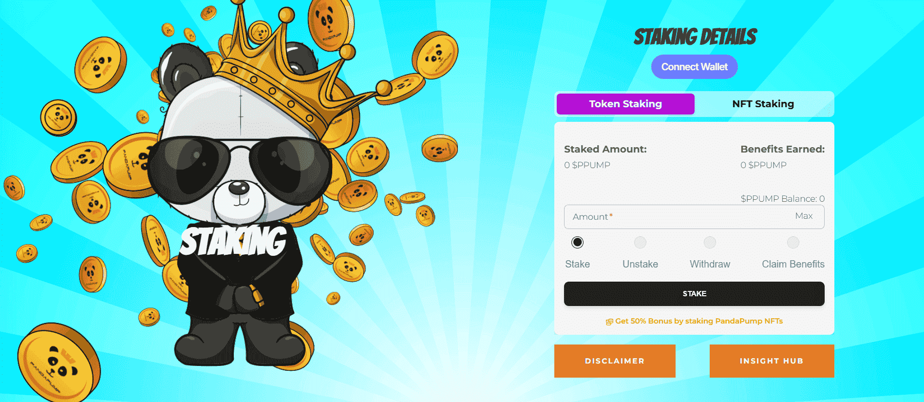 Panda Pump delivers an engaging NFT staking experience, combining interactive UI, yield farming mechanics, and on-chain reward tracking for its vibrant community. Designed with user experience and token utility in mind, the platform brings a fun and rewarding way to stake NFTs and earn passive income.